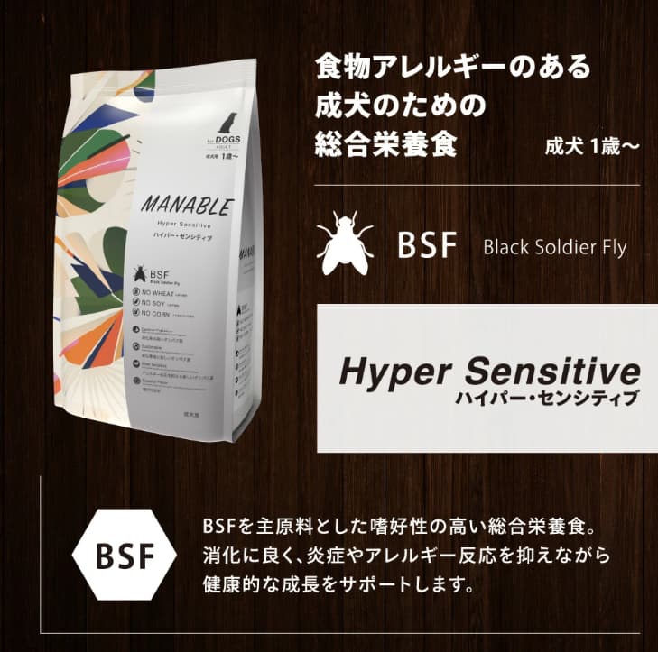 中でもMANABLE(マナブル/マナベル)は、アメリカミズアブを主原料にした成犬用のハイパーセンシティブ仕様ということで、「アレルギーに優しいフード」として気になっている飼い主さんも多いようです。