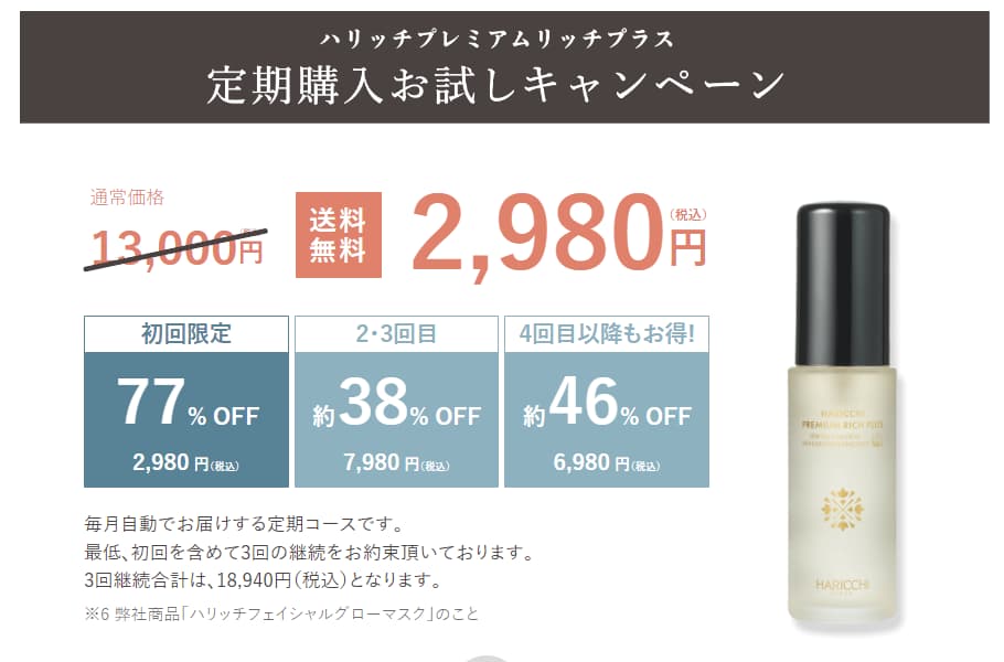 楽天市場やAmazonでも販売されている「ハリッチプレミアム」ですが公式サイトの定期コースなら、初回限定2,980円なのでかなりお得に購入できるんです。