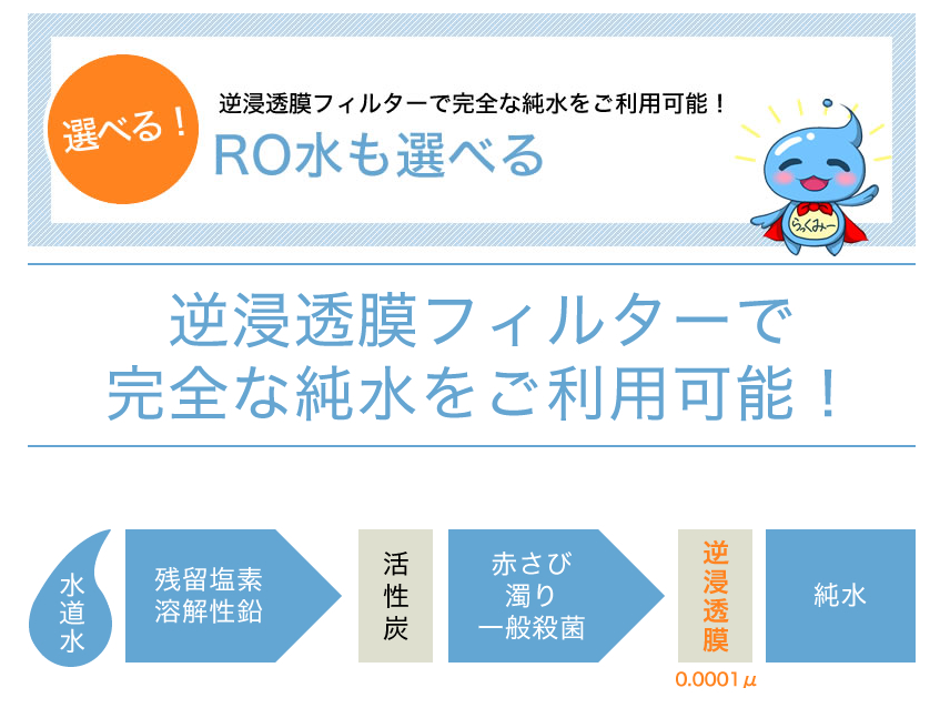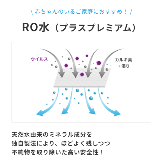 RO水は、RO膜(逆浸透膜)という特殊なフィルターを通し、不純物を限りなく除去した安全性の高い水です。