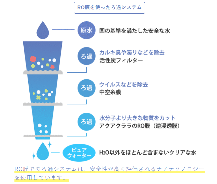 アクアクララはRO膜(逆浸透膜)で水の分子より大きな不純物をすべて除去してくれます。
