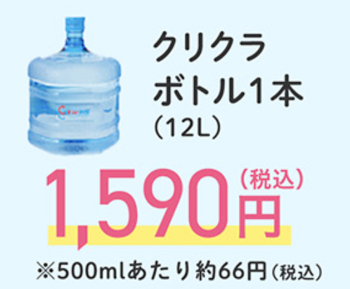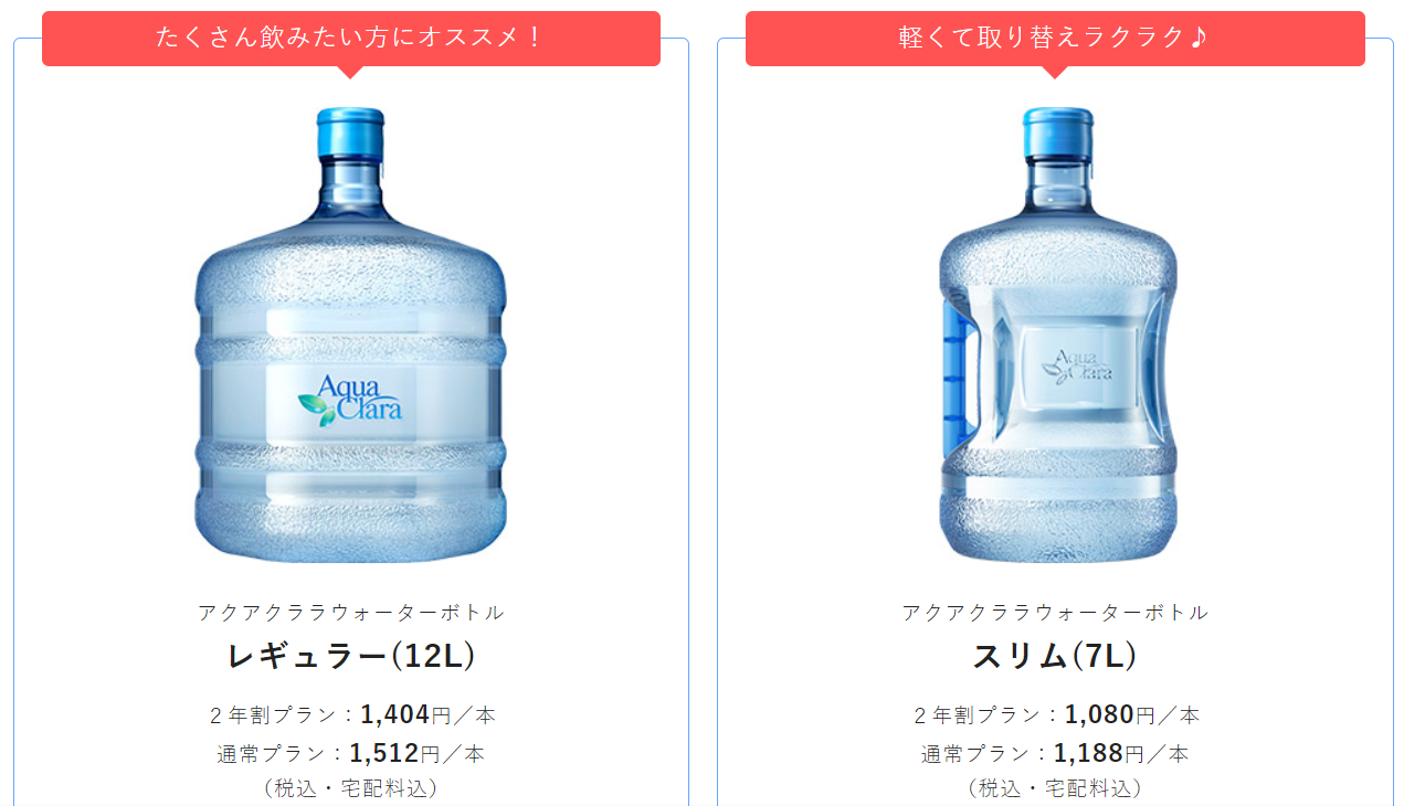ウォーターボトル 料金(税込) | レギュラー(12L) 1,404円(税込・宅配料込) スリム(7L) 1,080円(税込・宅配料込) |