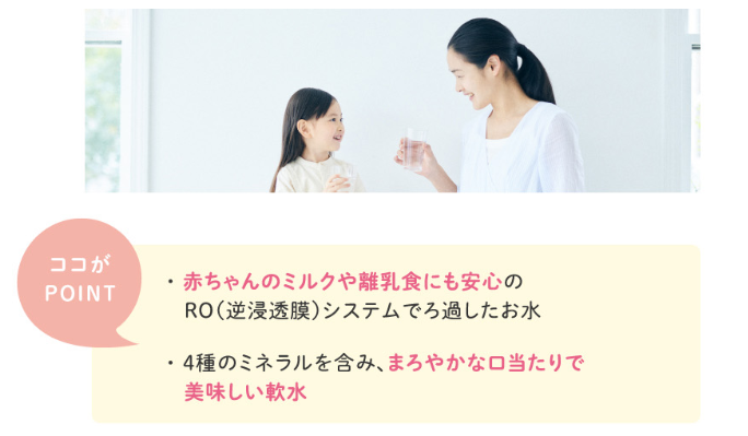 ミネラルがほとんど含まれていないため、赤ちゃんや妊婦さんの飲水としても選ばれています。