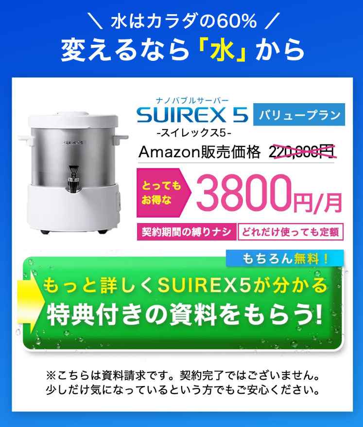 スイレックス5は、水道水を注ぐだけでナノバブル水素水を生成できる家庭用サーバーです。そのため、ペットボトルや宅配水の購入は不要で、毎月の費用は月額3,800円(税込)のみとなります。さらに、電気代も月約30円と経済的です。契約期間の縛りや解約金もなく、手軽に始められるのが魅力です。