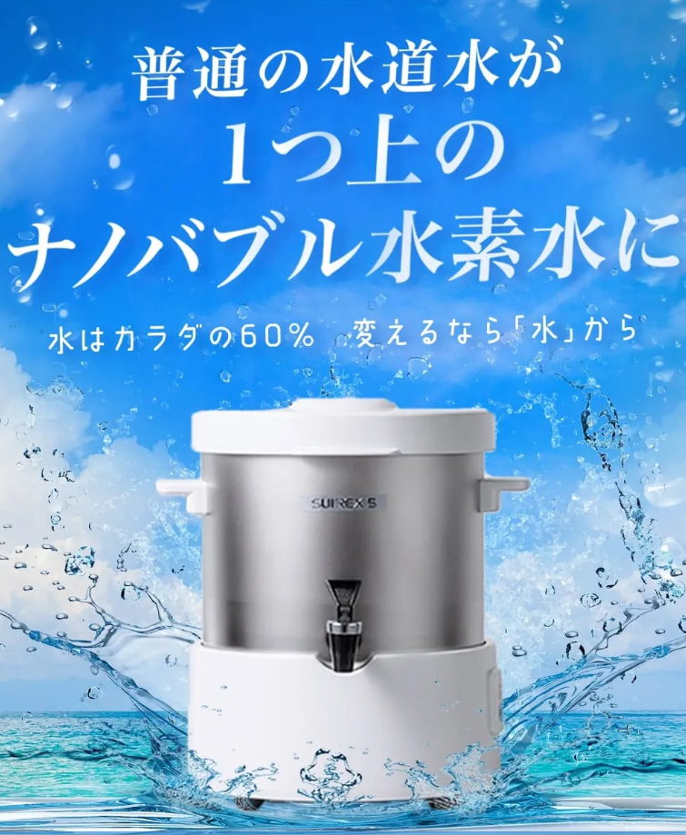 スイレックス5(suirex5)は、家庭用ナノバブル水素水生成器として注目されている製品です。開発・販売はコスモスエンタープライズ社。最大の特徴は、独自開発されたミネラルプレート構造によって、効率的に水素をナノバブル化し、水に溶け込ませることができる点です。