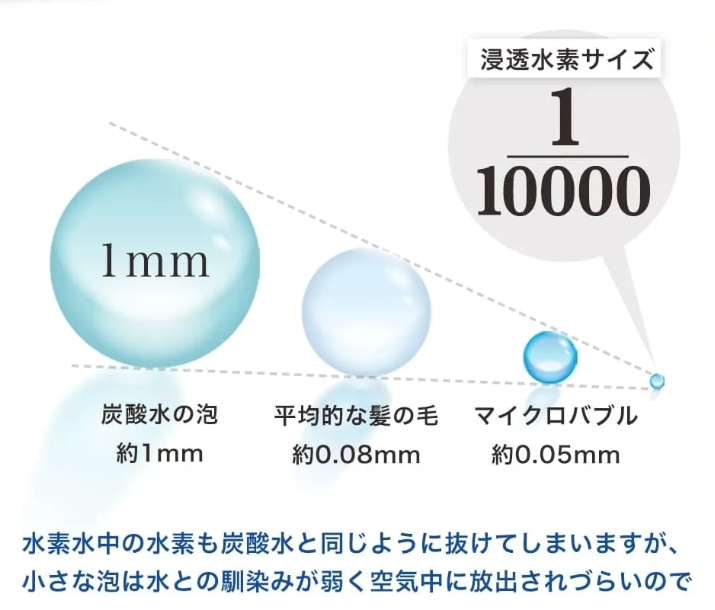 一般的な水素水生成器では、水素がすぐ抜けてしまう、あるいは濃度が低いといった課題がありますが、スイレックス5では「泡の細かさ」と「溶存時間の長さ」にこだわり、より体内に取り込みやすい水素水を実現しているのが強み。