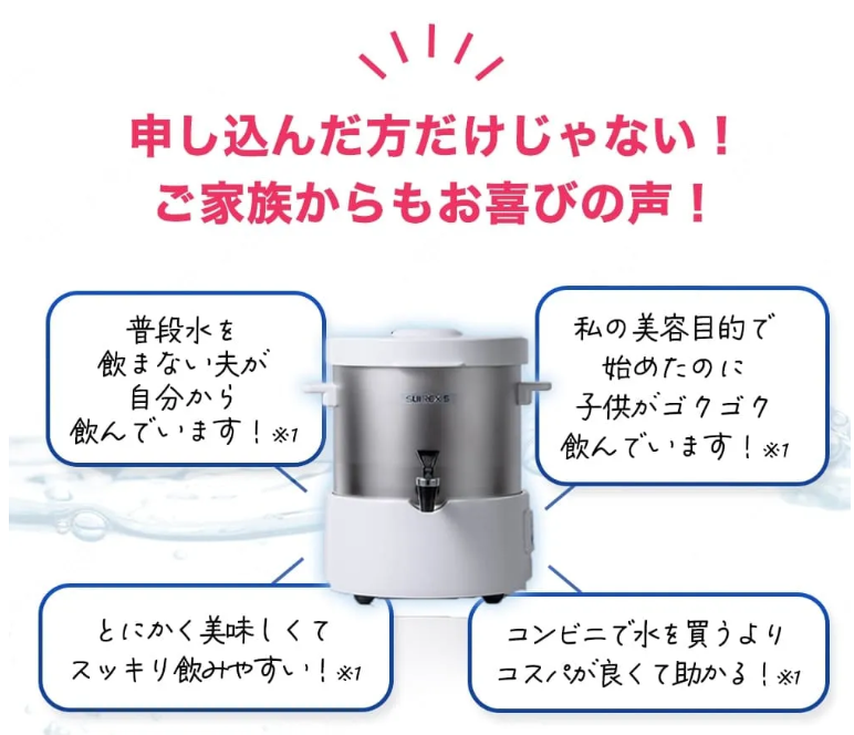 亜鉛やマグネシウムも含まれているし、塩素も除去されているので、家族全員で毎日ゴクゴクいただいています。これからも続けていきたいです。