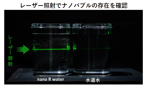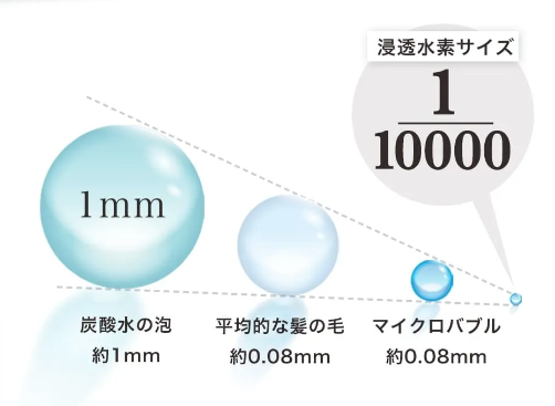 分類されている泡の中で「最も細かな泡」で、目視できるマイクロバブルと異なり、1ヶ月経過後も約90%が残存するほど長時間気泡の状態を保ちます。
