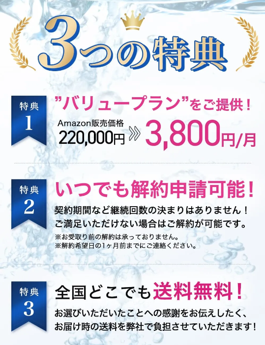 ナノバブル水素発生器に興味を持っていましたが、他メーカーで40万円以上すると言われて手が出ませんでした。でも、スイレックス5なら、毎月3,800円で使えて解約金もかからないので、気軽に試せて良かったです。気に入ったので続けていこうと思います。