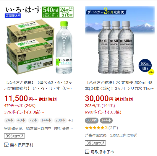 楽天市場でお水の定期便を探すと、ふるさと納税の定期便がヒットします。